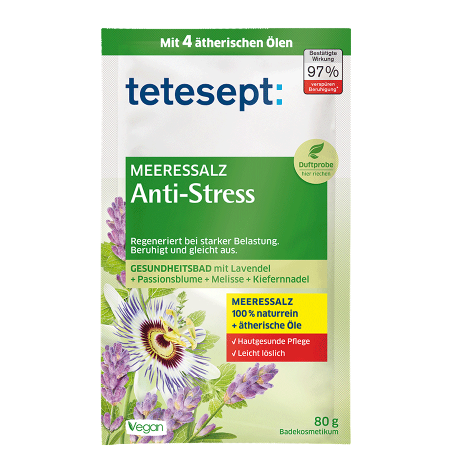 expand_circle_right Postavite pitanjeDodajte ¾ poklopca morske soli tetesept u tekuću vodu za kupanje temperature