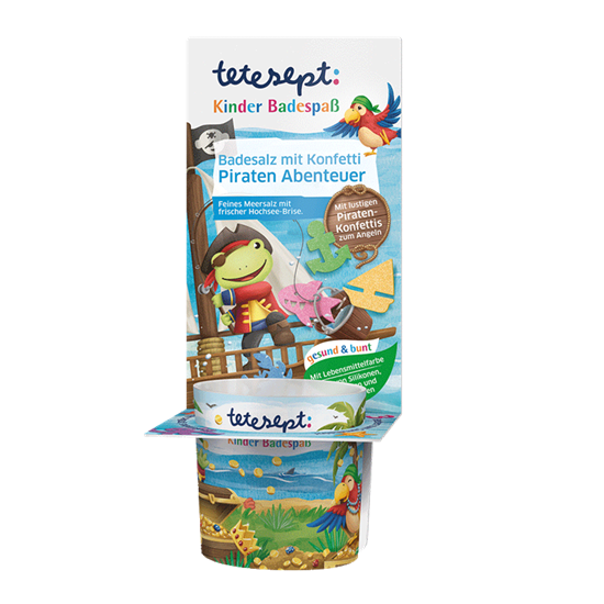 So se nalazi u zanimljivom pakovanju u obliku čaše, sa dečijim motivima i sadrži zabavne konfete koje plutaju po površini vode i mogu se hvatati i “pecati” uz pomoć čaše. Konfete se sastoje od neškodljivog kukuruznog skroba i počinju da se rastvaraju nakon 10 minuta.