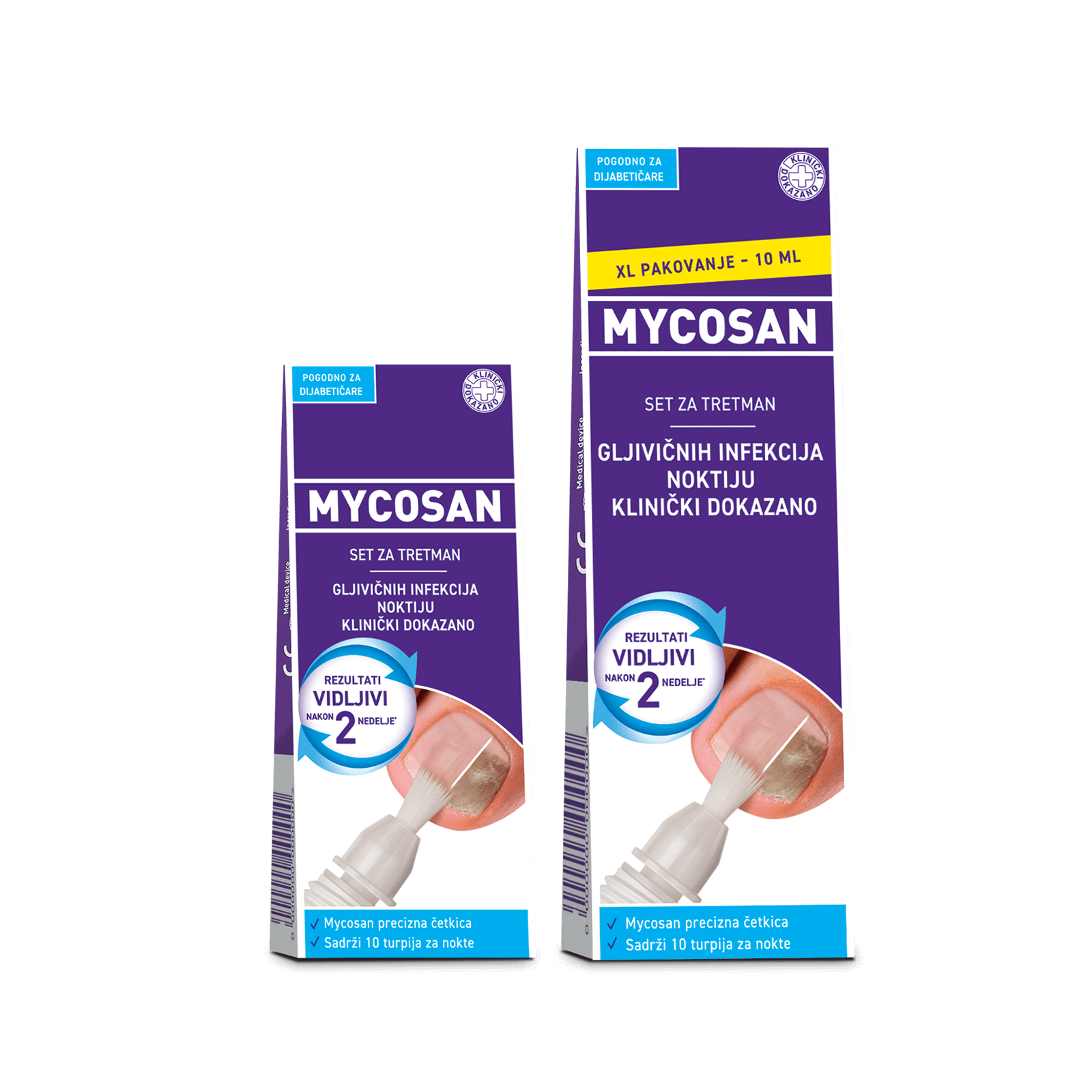 Mycosan set za tretman gljivičnih infekcija noktiju sprečava gljivične infekcije noktiju (bele površinske onihomikoze i distalno-lateralne subungvalne onihomikoze) uzrokovane gljivicama kao što su T. rubrum, T. mentagrophytes i E. floccosum. Onihomikoza je gljivična infekcija noktiju koja dovodi do promene boje, zadebljanja i odvajanja nokta od nokatnog ležišta. Gljivična infekcija noktiju se mora tretirati da bi se sprečilo širenje infekcije ili njeno pogoršanje.